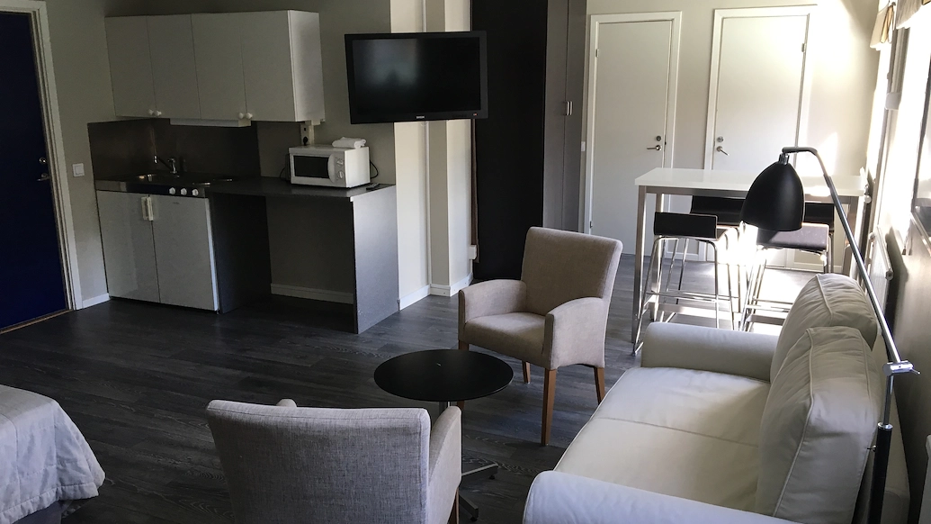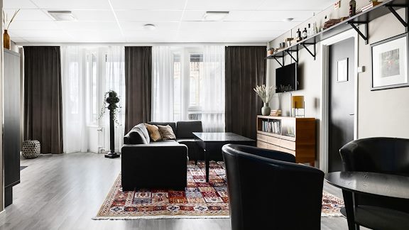 På plan 1 finns det plats för avkoppling eller sällskaplighet. Här finns det en stor soffgrupp och en mindre sittgrupp samt TV.